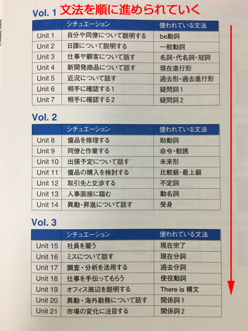 ビジネス英語を学ぶと言うよりは、中学校で教わった文法を復讐しながらビジネスに使えそうな語彙を絡めて覚えて行く感じになっています。