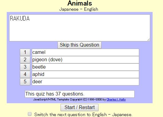 これらの言語での問題は、例えば日本語の場合だと「ラクダ(RAKUDA)」という日本語を英語に訳したものを選ぶというような勉強方法になります。